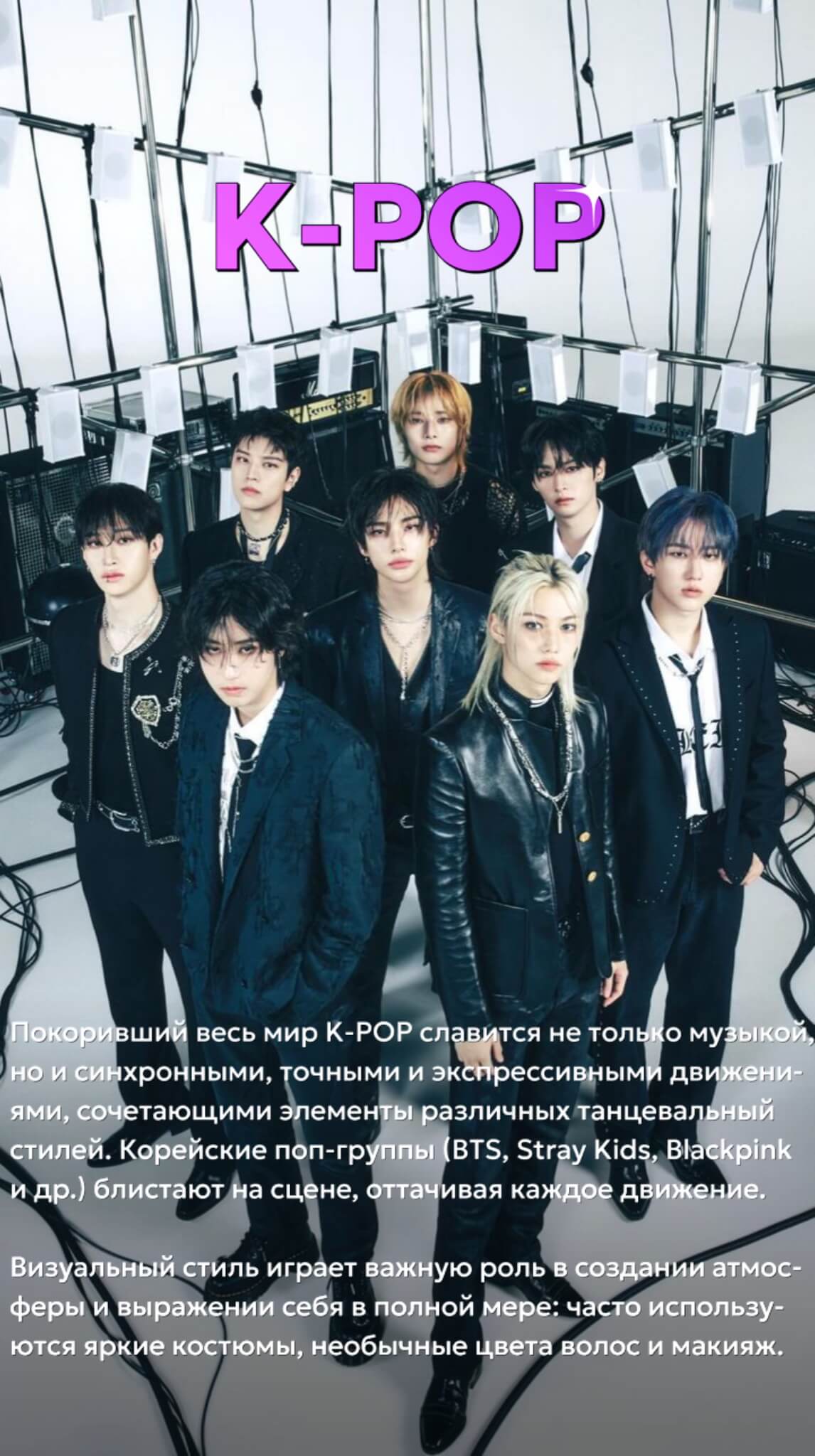 Покоривший весь мир K-Pop славится не только музыкой, но и синхронными, точными и экспрессивными движениями, сочетающими элементы различных танцевальный стилей. Корейские поп-группы (BTS, Stray Kids, Blackpink и др.) блистают на сцене, оттачивая каждое движение.